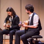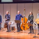 Der letzte Teil brachte Entdeckungen Menuhins in verwandten Bereichen. Bartok für Geige allein gab Shoko Murakami Gelegenheit zu glänzen. Danach die Begegnung zweiter Welten: Menuhin und der Jazz-Violonist Stéphane Grappelli. Hierfür war ein Sextett ehemaliger LMN-Stipendiaten aufgeboten: die Geigerinnen Nele Schaumburg und Kayako Bruckmann, dreimal Gitarre (Frederik Schlender, Nicolas Kücken, Patrick Farrant) und Kontrabass (Jan-Niklas Eichert). Zum Schluss kamen Klarinette (Bernd Ruf) und Posaune (Luka Stankovic) hinzu. Mit Swing, Klezmer und Zigeunerjazz wurden die Besucher verabschiedet; nach ziemlich genau vier Stunden. /kd